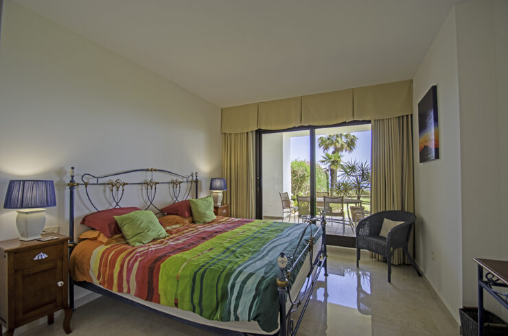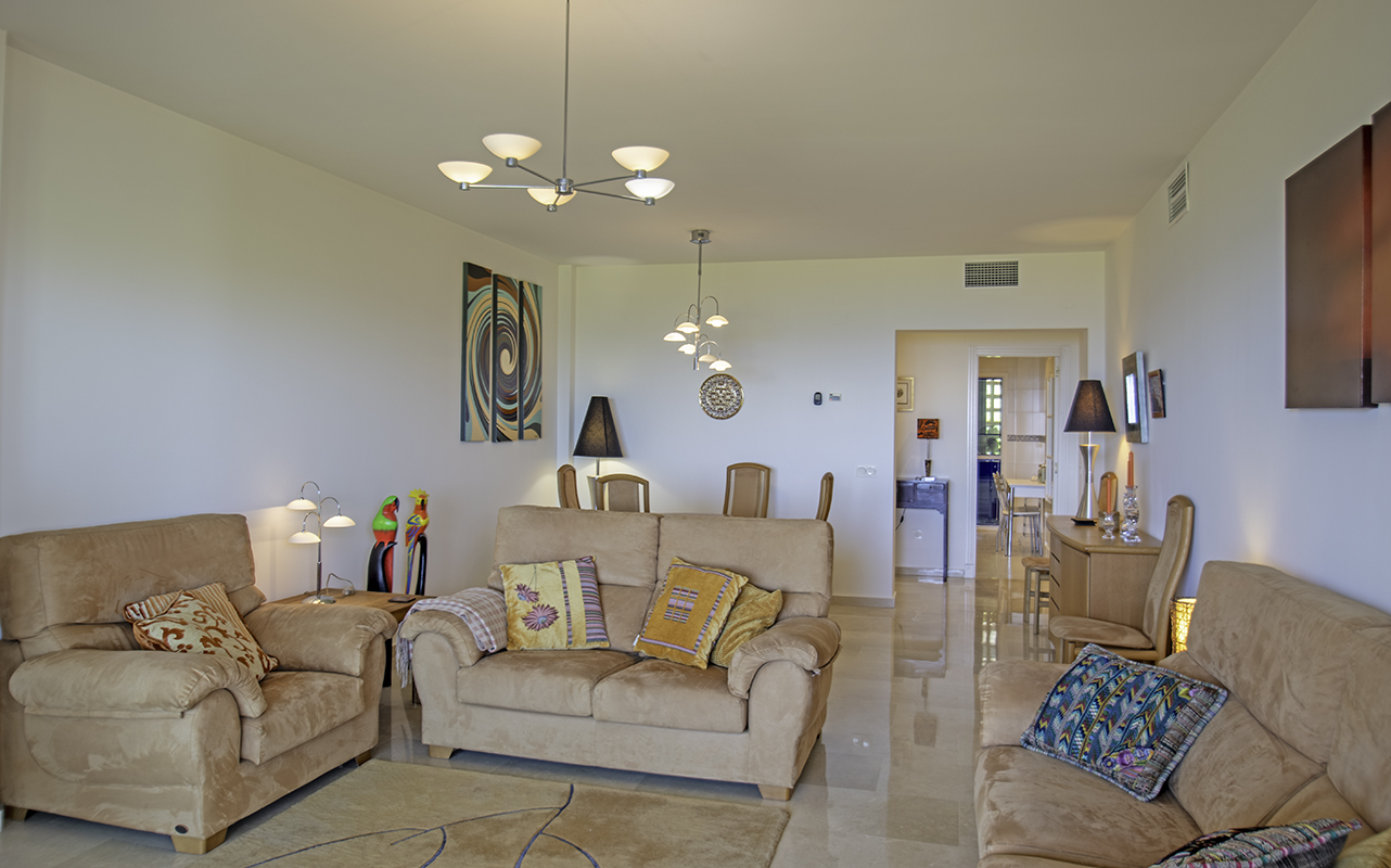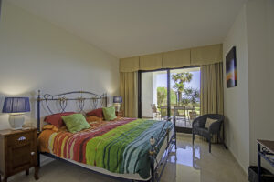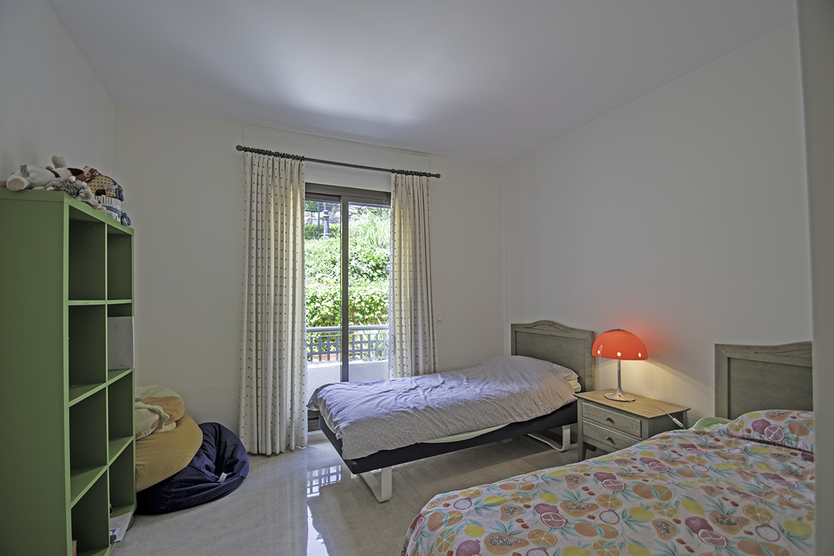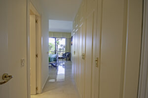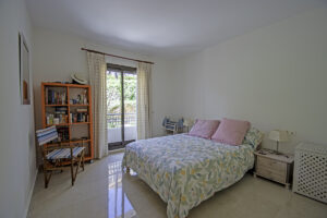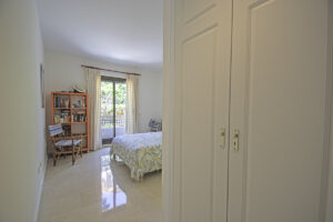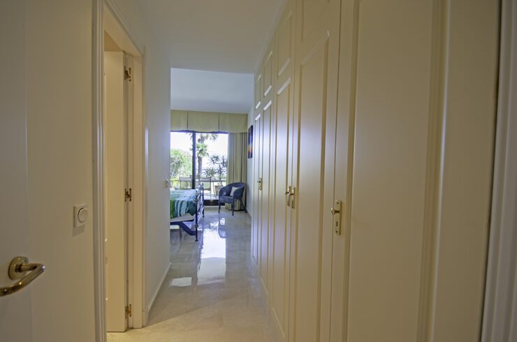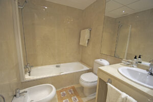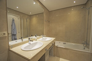 - Dormitorios y salón con pavimentos de mármol crema marfil.
