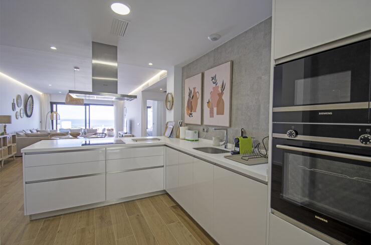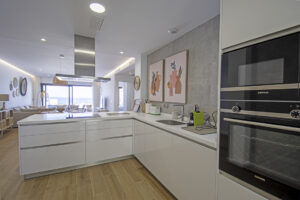 - Puertas y frentes de armarios en madera lacada en blanco.